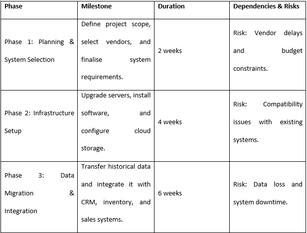 • Project Phases & Milestones (e.g., system selection, data migration, testing, training, full deployment).