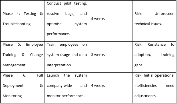 Employee acceptance stands as the essential requirement for project triumph. The staff will need training programs that help them master system usage skills while acquiring data interpretation abilities. The system will be better utilised when staff gets proper support from management as well as effective clear communication to address possible resistance to new technology (Mittal, 2024).