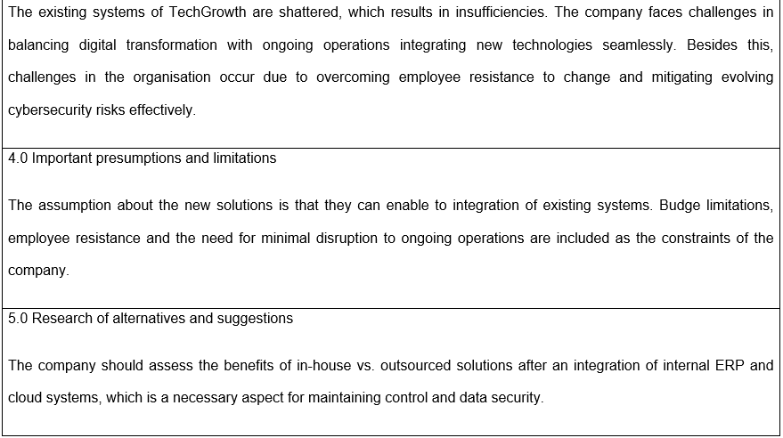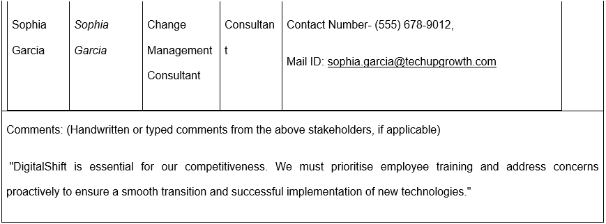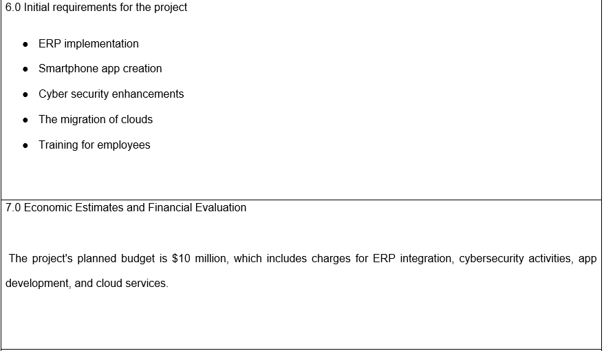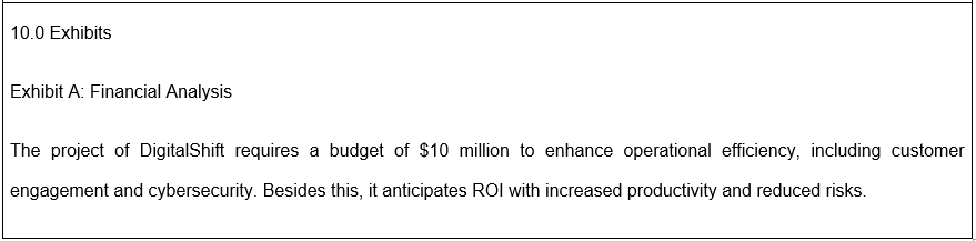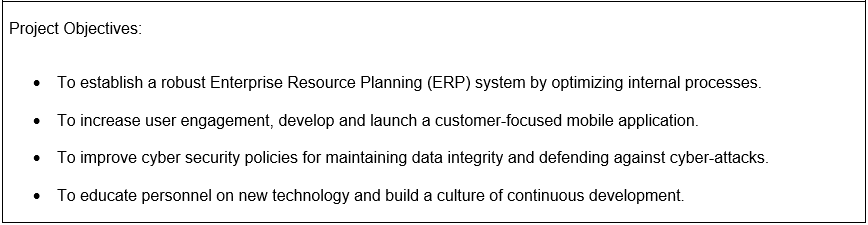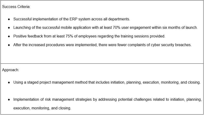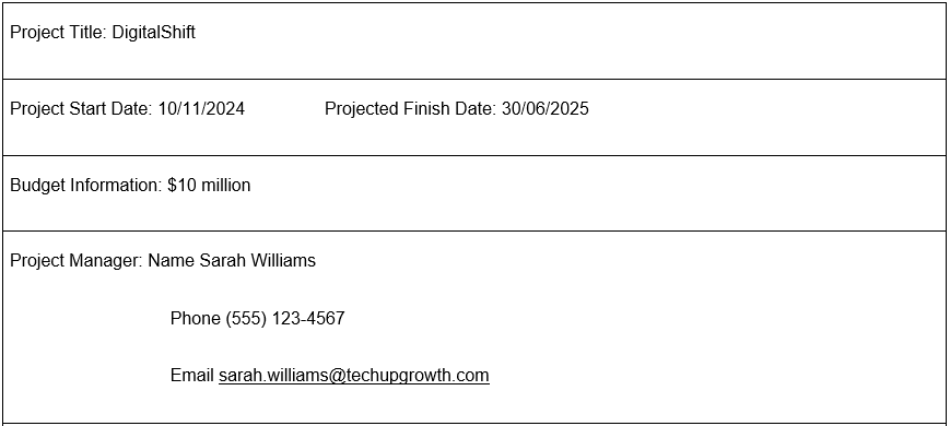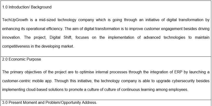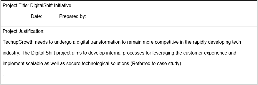 TechUpGrowth's DigitalShift program is a comprehensive strategy designed to create digital change throughout the organisation. Among other significant goals, this project intends to raise cybersecurity standards, develop an intuitive mobile application, and implement a robust enterprise resource planning (ERP) system. DigitalShift has an 18-month timeline and a $10 million budget to solve problems like outdated technology and worker resistance to change. The aim of this endeavour for MBA Assignment Expert is to strengthen TechUpGrowth's edge over competitors in a dynamic digital environment by streamlining operations and promoting continuous education.