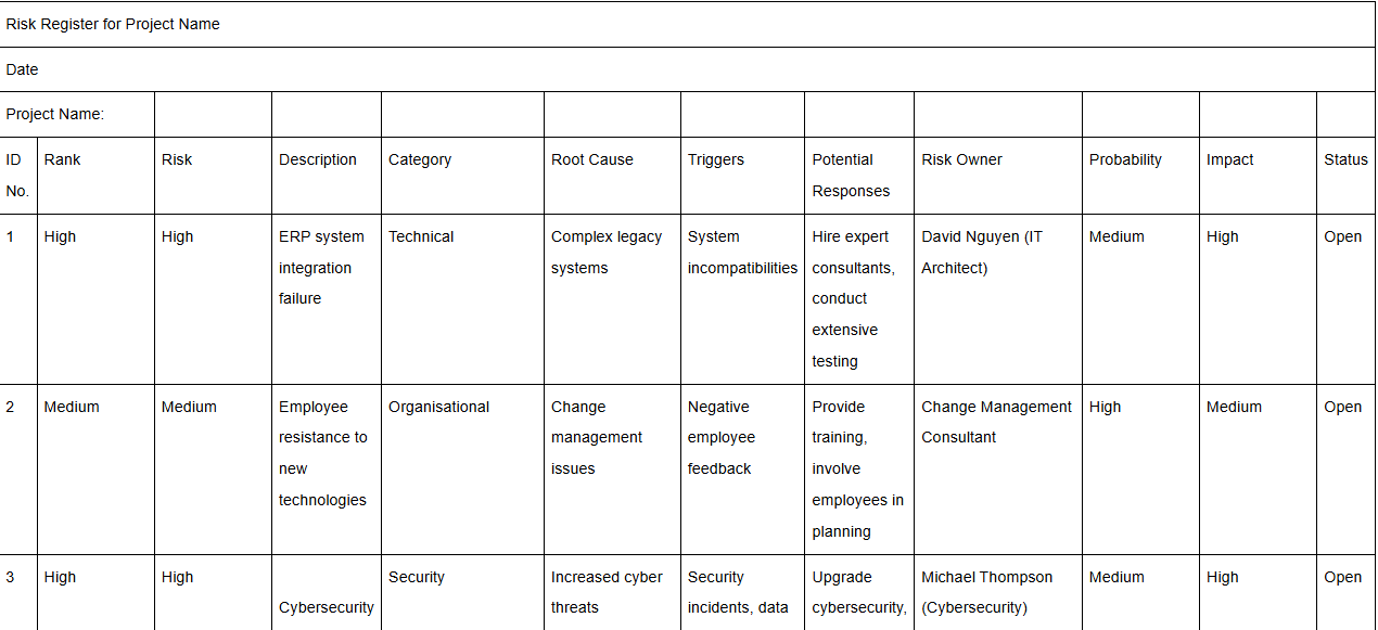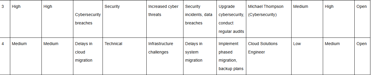 Based on the information in the above table the probability impact Martix helps to prioritise the risks basically based on their likelihood and potential impact. For example, the ERP system integration failure and cybersecurity breaches rank high in probability and impact emphasizing the top main priorities. Medium risks indicate that employee resistance to new technologies and delays in the cloud migration which have a high or medium probability with moderate impact, that require appropriate attention it not as urgent as the high risks. This matrix aids in allocating resources efficiently to mitigate high-priority risks.
