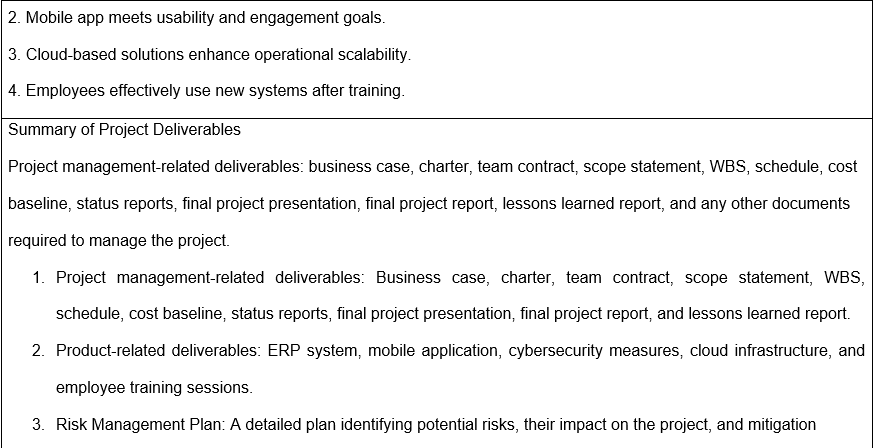 Once you have established the necessary assumptions, your group need to produce project management plans and other documents considering the project requirements you have selected. The completed project report should contain 6 main parts (9 tasks) as listed below: