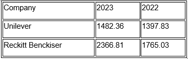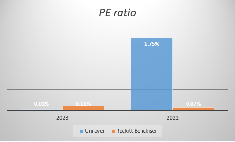 Both companies compete in similar spots with Reckitt Benckiser and Unilever Positives : Reckitt Benckiser has a far higher P/E in 2023 vs Unilever (2366.81 vs 1482.36) meaning that expectations for future earnings growth is far higher for Reckitt. It could be due to growth in the health and hygiene sector that continues to see demand following the pandemic.