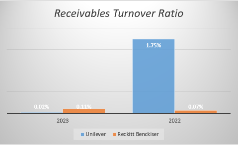 Unilever collects payments faster and has stricter credit policies as evidenced by its 9.29 receivables turnover ratio in 2023 striding above Reckitt’s 6.97. Such efficiency aids in ensuring healthy cash flow and minimising bad debts.