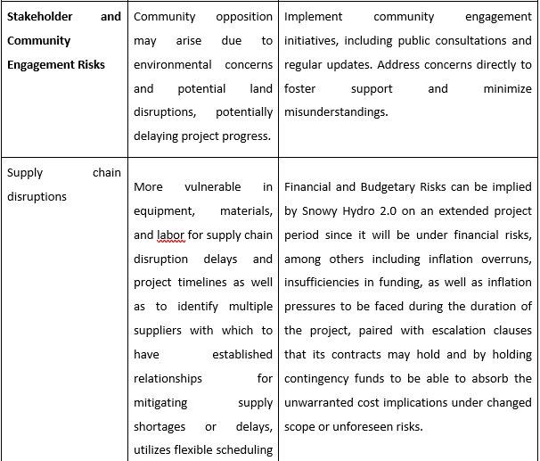 Snowy Hydro 2.0 relies on international partners like WeBuild, Lane Constructions, and Voith Group. Effective coordination among these stakeholders is essential for meeting project objectives. Establishing clear communication channels helps ensure that each organization understands its role. Using digital project management platforms enables consistent updates, reducing miscommunication risks (Vasudevan et al., 2023). Regular meetings with other teams result in a better definition of goals and due dates. Moreover, maintaining all the communication within the specific project in the hands of the central project manager reduces the confusion among stakeholders. This way of establishing teams makes it easy to have order in the mush of employees in different parts of the world. It is an important renewable energy project in Australia to support Australia’s low-carbon transformation plan. Some of the goal of this project include; energy demand supply, grid stabilization, employment creation within the region, and favourable Australian climate change goals. Communication with stakeholders, governments, and utilities, as well as community involvement is highly requisite when seeking to explain the process and/or deal with emerging issues.