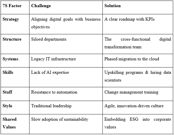 Woolworths’ desire for digital transformation mandates the meeting of challenges across the McKinsey 7S framework that can undermine the process (Farrell, 2022). Aligning digital initiatives and trade goals is a strategic challenge; if priorities remain hazy, paralysis can ensue. A road map with clearly defined KPIs for measurable outcomes guides the transformation modality. The organizational structure of the company is mostly characterized by siloed departments, which limit the degree of cross-functional cooperation; tasks are best done on a more collaborative basis. The creation of a digital transformation team will pull things together into one coherent entity, thus improving efficiency and integration. Old IT infrastructure continues to be a major blocker to innovation; therefore, another hurdle has been the legacy systems (Grunt & Potejko, 2024). A phased approach to migrating workloads to cloud computing enhances scalability, security, and operational agility.