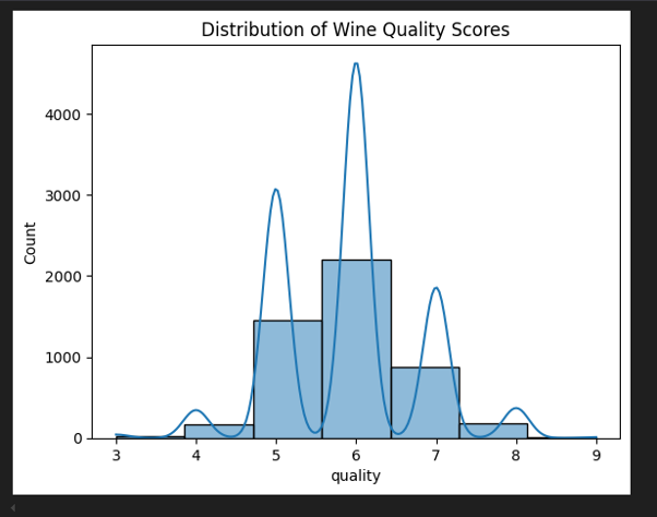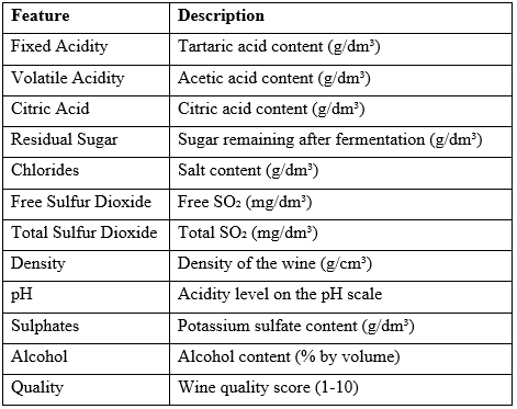 • The distribution of wine quality scores indicates that most of the wines cluster around the interval of 5-7, with fewer cases of the extreme values (scores of 1 and 10) (Cortez et al., 2009).