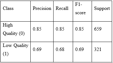 • Precision: Measures the number of the predicted "high-quality" or "low-quality" wines that were correctly classified.