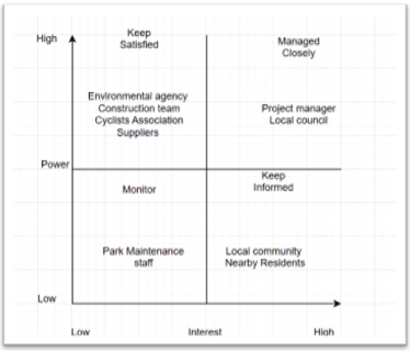 The power/interest matrix categorises stakeholders according to their level of power, and their interest in the project. The decision rules indicate that the low-power interest stakeholders such as the public, the Project Manager, and the Local Council should be “Managed Closely” which can be done by providing them with details of the project and involving them in decision-making (Pidgeon and Dawood, 2023). The stakeholders who are highly interested but moderately powered are the Environmental Agency and the Cyclists Association. They should be notified regularly but less often they should “be kept satisfied”. Local Community Members and Nearby Residents are interested stakeholders with the least amount of power (Nguyen et al. 2021). They should be managed by “informing” them to gain their support. The low-power and low-interest stakeholders as the Park Maintenance Staff can best be addressed by the “Monitoring” method that requires only occasional adjusting of expectations.