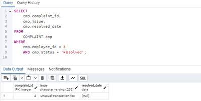 This query retrieves complaints resolved by a particular employee using nested queries to focus on resolved cases.