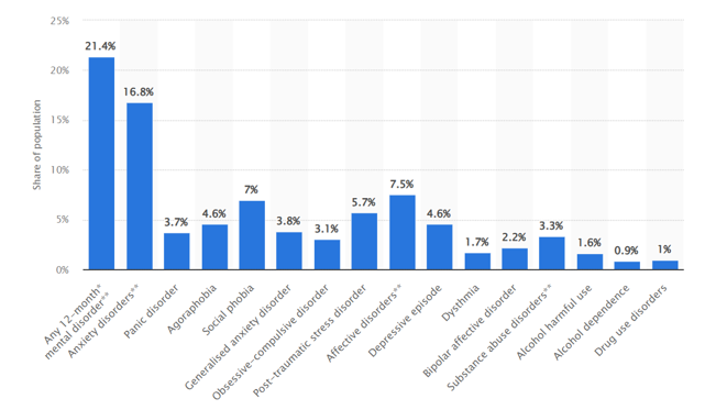 Anxiety disorders have been listed among the mental disorders mentioned in both DSM-V and ICD 10 models which people have been suffering in many forms (Hyland et al., 2016). Anxiety disorder among people has become quite prevalent in Australia considering the current turbulence and sudden changes in the environment and society. Mostly, anxiety disorders within people take place due to some traumatic events and life experiences. According to Bjornsson et al., (2020), traumatic child life experiences can result in anxiety disorders within people in later stages of their lives. In Australia, it can be noticed that a large section of the population (16.8%) is suffering from anxiety disorder which stands at the second position just after the overall population with mental disorders (21.4%) (Statista, 2024) [refer to figure 1]. The numbers are quite serious and a matter of concern for sure which needs to be addressed in the best possible ways for ensuring a better quality of life for the people.