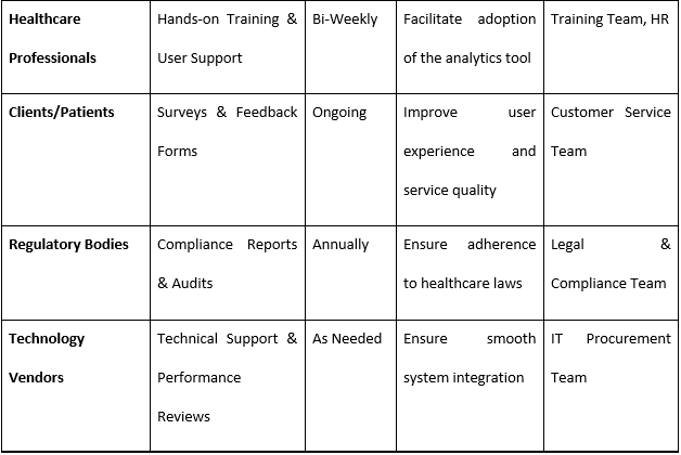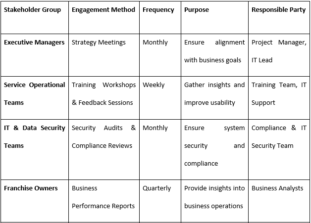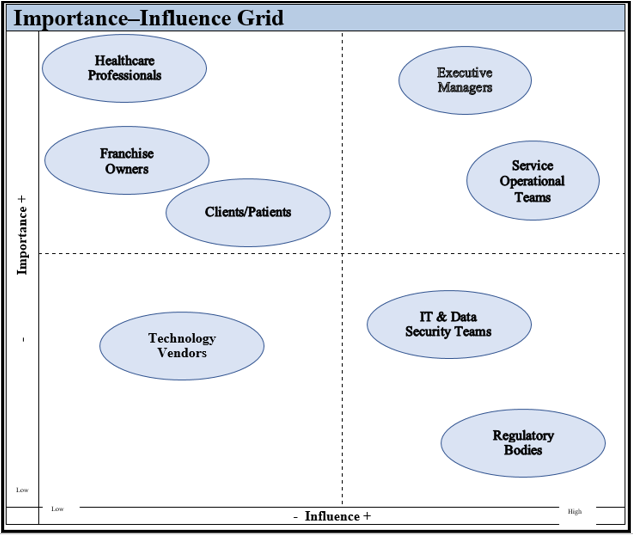 Stakeholders for this digital change are personnel, patients, franchisees, IT specialists, and other members of the management. There is a need to establish a suitable scheduling and workload management system to enable healthcare professionals to perform their tasks efficiently. Many clients, and patients in particular, accept straightforward appointment booking and other services. The franchisees are made to benefit from the standardized procedures and operation policies formulated. IT professionals have the responsibility of undertaking integration of systems, secure data management and provision of compliance. New technologies are managed and adopted within the company at the executive management level to support the business strategies (Baset & Jradi, 2025). It is essential to involve all stakeholders by providing them with training, feedback, and other forms of decision support as well as adopting an implementation strategy that comes in phases.