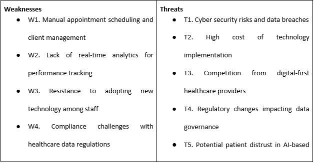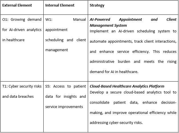 In the SWOT analysis of Horizon Health, there are some weaknesses and threats that the AI-powered appointment and client management system can address. It reduces manual scheduling disparity (W1) and improves real-time scoring for performance monitoring (W2) with other opportunities such as the increasing popularity of AI-based healthcare solutions (O1). Besides, there are also other advantages, such as minimizing administrative work so that the healthcare professionals can utilize their time for providing care to patients (Li et al. 2025). This also promotes compliance with the data privacy laws (O4) since the data collected will be protected. Using AI as a growth strategy for Horizon Health has benefits on operational efficiency, patient experience, and competitive positioning, as well as risk factors such as inflated technology costs (T2) and employee reluctance (W3).