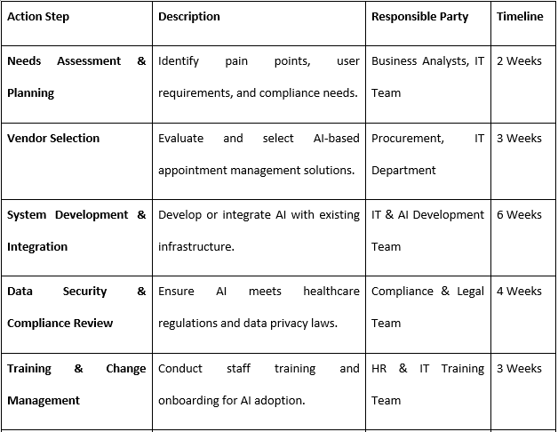 It is seen that by adopting an AI-based appointment and client management system, Horizon Health can improve its operations. This system will incorporate artificial intelligence chatbots and voice interfaces for appointments and patient reminders, thus cutting time on managing client issues. There shall also be algorithms used to enhance the time and efficiency of the available resources (Jobe et al. 2024). Also, in terms of analytics, patients’ throughput and service requirements will be analyzed and managed in real time. Horizon Health should extend the integration of AI solutions to existing systems to increase efficiency, decrease errors, and improve patient’ satisfaction.
