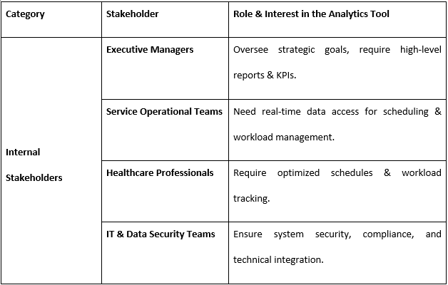It is important to consider the stakeholders’ requirements that would act as a guideline in developing a Horizon Health analytics tool that will be user-friendly. The executive managers who are internal stakeholders expect to have high-level dashboards as well as performance indications for decision-making. These service operational teams require timely information on schedules and workload, particularly concerning appointments. Workload tracking is essential to healthcare professionals since it helps increase productivity and decrease stress (Mahadevkar et al. 2024). IT and data security personnel need hands-on ways of achieving proper governance on data to meet all the security policies, while data analysts require clean, structured data to work on.
