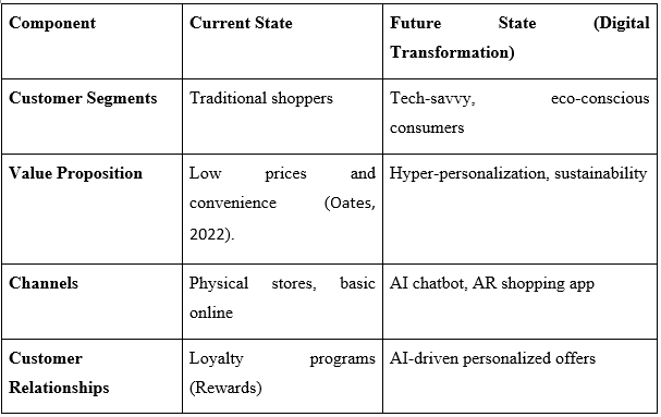Arguably, Woolworths has confronted massive digital transformation challenges, not the least of which stem from the old IT systems that inhibit technological progress and operational agility. Legacy infrastructure imposes scalability constraints, wherein 75% of enterprises bar digital adoption efforts down due to system constraints (Mobit, 2023). This old technology, in fact, affects the very fabric of real-time data processing, automation, and customer experience enhancement, all of which go on to make competition harder for Woolworths. Amazon Fresh has become one of Woolworths' competition pitfalls, as AI-based logistics enable delivery to be carried out with a 30% time advantage over traditional retail models, thus posing a huge threat to Woolworths. By having inventory management systems and automated fulfilment centres in place, Amazon is fostering the customer expectation of speed and convenience. Another major challenge is hyper-personalization, with 71% of customers expecting brands to deliver individual shopping experiences (Saxena & Muneeb, 2024). Modern consumers want personalized product recommendations, customized promotions, and a seamless omnichannel experience. Not meeting these expectations can cause dissatisfaction and reduced retention. While digital-native competitors monetize their AI and big data to refine personalization, Woolworths must strive to move faster digitally in order to keep pace. Notwithstanding these challenges, Woolworths still has notable opportunities to tap new technologies in its favour. AI supply chain optimization reduces waste and increases efficiency. Models have successfully shown a 40% reduction in spoilage (Singh & Kaunert, 2025). An expansion of Woolworths' digital marketplace, modelled on Amazon's ecosystem for online grocery sales, should help with revenue growth, as this segment is expected to reach $12 billion in Australia by 2025 (Pwaka, 2021). With this technology, traceability of food products can be increased through blockchain, enhancing transparency and trust. Research shows that 88% of shoppers will pay more for products with verified sourcing information (Venkatesh et al., 2022). Woolworths can strengthen its market position, improve operational efficiency, and satisfy changing consumer expectations through implementing these advanced solutions.