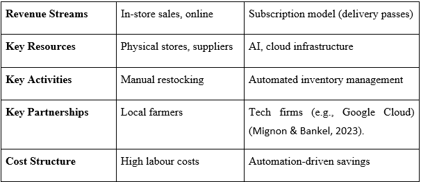 The digital transformation strategies at Woolworths promise enormous returns, especially regarding costs and revenue. The entire operation, from the supply chain to inventory and customer service, should be 20% lower by means of automation (Vaka, 2024). The automated bulk handling system has been found to increase productivity by about 25% by cutting down on labour costs and human errors (Kubasakova et al. 2024). There will be a further boost in productivity with process automation applied to the procurement and logistics area with faster ordering and stock level optimization. AI-enhanced personalization is predicted to increase online sales by 30%, commensurate with the change in consumer expectations (Reddy & Nalla, 2024). Studies find that 80% of shoppers are more willing to purchase a brand that provides a personalized experience (Zimmermann et al., 2023). Modern recommendation engines driven by machine-learning technologies analyze shopping behaviour to send tailored promotions and product suggestions. Such high-level personalization elevates customer engagement and increases retention and, ultimately, revenue growth. Woolworths thus has an unmatched opportunity for enhancing digital competitiveness through the integration of automation and AI-based personalization (Oyaka, 2024). These will ensure operational efficiency and, hence, profitability while also enhancing customer experience. With the growth in online grocery sales in Australia, Woolworths will realize long-term success in a technology-oriented industry through its digital transformation efforts.