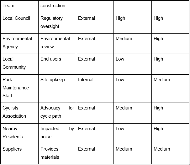 The power/interest matrix categorises stakeholders according to their level of power, and their interest in the project. The decision rules indicate that the low-power interest stakeholders such as the public, the Project Manager, and the Local Council should be “Managed Closely” which can be done by providing them with details of the project and involving them in decision-making (Pidgeon and Dawood, 2023). The stakeholders who are highly interested but moderately powered are the Environmental Agency and the Cyclists Association. They should be notified regularly but less often they should “be kept satisfied”. Local Community Members and Nearby Residents are interested stakeholders with the least amount of power (Nguyen et al. 2021). They should be managed by “informing” them to gain their support. The low-power and low-interest stakeholders as the Park Maintenance Staff can best be addressed by the “Monitoring” method that requires only occasional adjusting of expectations.