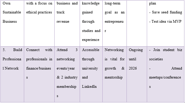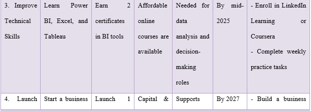 • 2026-2027: Launch a sustainable business, gain industry experience, and become a senior business analyst.